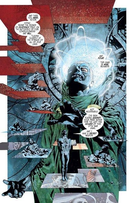 Numero #4: Seguiamo la storia di Reed Richards, Mister Fantastic, il più intelligente umano sul pianeta, incapace di comprendere l’animo umano, ma conoscitore dell’universo in lungo e in largo. Ha quindi delle visioni, nel suo Pensatoio: un altro sé, uno malvagio, che ha nascosto fuori da sé, in una maschera di ferro per celare le emozioni violente, dominanti, che lo tormentavano. Ma ciò non è vero: Destino sta usando una macchina per riscrivere le vite dei Quattro, per annientarli partendo dalla loro intimità. Namor e Johnny, secondo le predizioni di Reed, si schiantano sulla testa del Doombot. Reed, per battere la struttura imposta da Destino, elasticizza il suo cervello, ragionando su strade mai percorse prima: i Fantastici Quattro, Namor, perfino Alicia, fanno parte di un’equazione vincente, autoriparatrice, che riesce ad annichilire ogni piano di Destino. Ben riguadagna i suoi poteri e Susan affronta Destino, che si rivela essere solo un infantile e permaloso ometto (“Te ne stai qui seduto con le tue stupide macchine e la tua gelosia infantile, mentre dovresti curare il cancro o portare i nostri simili verso le stelle” dice lei, anticipando una linea di dialogo diretta a Lex Luthor in All-Star Superman): infine, dopo che tutto ritorna alla normalità e la famiglia si riunisce, Destino urla da solo per la rabbia nel suo castello in Latveria.
