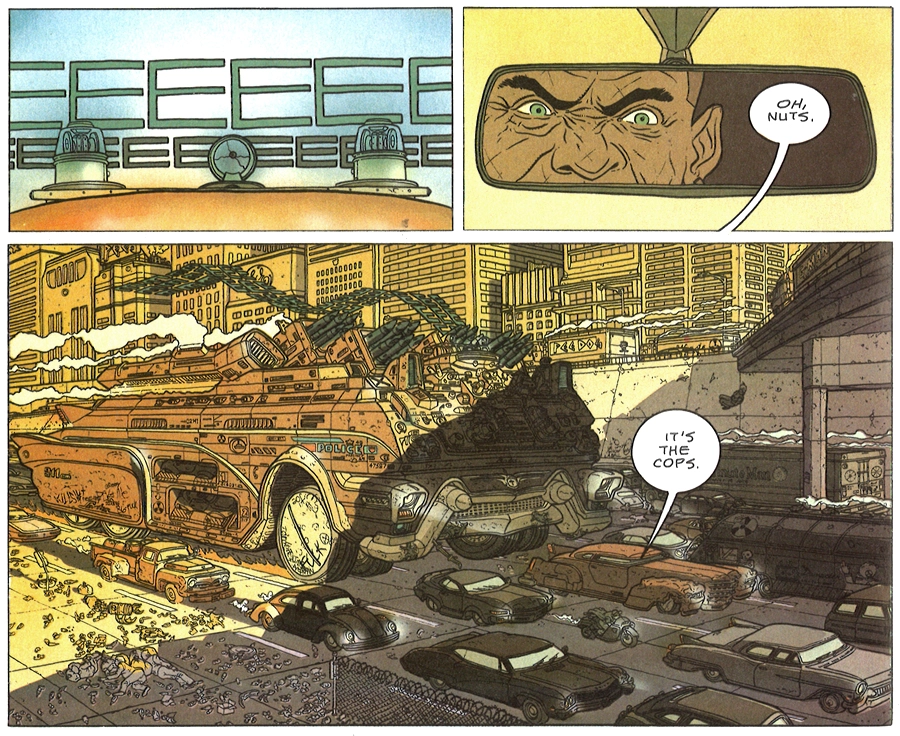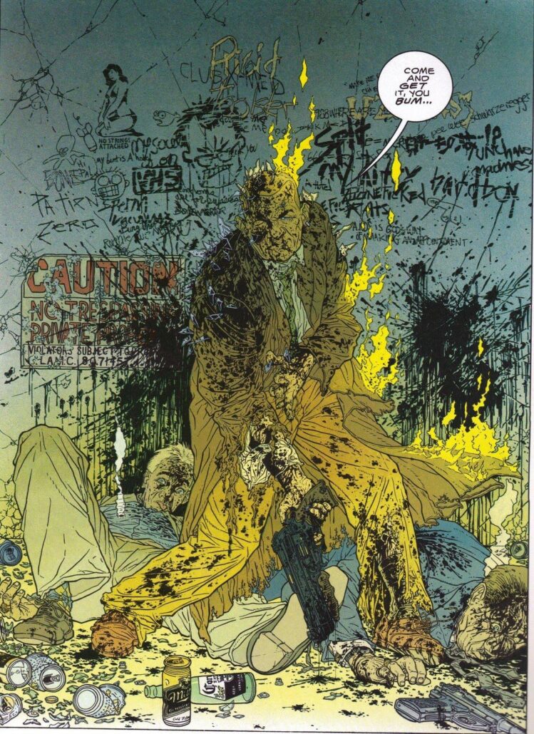 La storia appare discontinua, una serie di eventi sia reali che irreali, mescolati fra loro in un tumulto di azione e violenza. Un mondo complesso, dettagliatissimo, che Darrow mette insieme con cura, articolando in ogni scena anche i più piccoli pezzi metallici, i frammenti di automobili, i cavi, costruendo una città che è fatta di infrastrutture ed elementi meccanici futuristici. In questo ambiente, troviamo Nixon, un omone stempiato, un esattore delle tasse, anche se però svolge il lavoro in maniera non convenzionale, uccidendo gli evasori fiscali senza pietà e non salvaguardando minimamente il proprio corpo nel mentre. A pagina 11, Nixon muore. Non è la prima volta che muore, ma Nixon, che intanto viene rimontato dagli scienziati della Willeford Home Appliances, questo non lo sa. In verità quello che Nixon non sa è davvero tanto, perché continua a sbagliare il proprio nome, chiamandosi “Harry” o “Charles”, “Seltz” o “Burns”, e continua a ricordare cose che non sono successe, come se vivesse in due posti e tempi contemporaneamente. In un meraviglioso e brillante sovvertimento del genere hard boiled, in cui spesso il protagonista è un veterano che soffre di PTSD, Miller crea una versione artificiale del disturbo, adatta per un robot che crede di essere umano e le cui memorie vengono costantemente riscritte, modificate e cancellate. In un mondo governato da mega-aziende che fanno ciò che vogliono della società, una ribellione dei robot, trattati come cittadini di seconda categoria, sembra inevitabile. E in un macrocontesto del genere, di schiavismo, ultraviolenza ed esperimenti, cosa è Nixon? Una vittima, nulla di più, allo stesso modo in cui i classici detective erano vittime dell’aver servito in guerra. Il povero “esattore delle tasse” rappresenta l’uomo comune in una civiltà che non ha il minimo rispetto per lui, che invece vuole solo cercare di tornare a vivere la sua vita, stufo dei soprusi e delle assurde complicazioni dolorose della sua condizione. Lo svolgimento della storia di Hard Boiled è inusuale per lo stile di Frank Miller: per essere un autore che ha popolarizzato di nuovo negli anni ’80 la forza del superuomo, che mette sé stesso in gioco costantemente e riesce a vincere contro i regimi opprimenti, Nixon alla fine perde e viene nuovamente soggiogato. La ribellione non vince. Viene da chiedersi se sia il semplice modo di emulare i generi di riferimento (come l’eponimo hard boiled e la fantascienza alla Philip K. Dick) o solo una temporanea ritrattazione della filosofia dello scrittore.