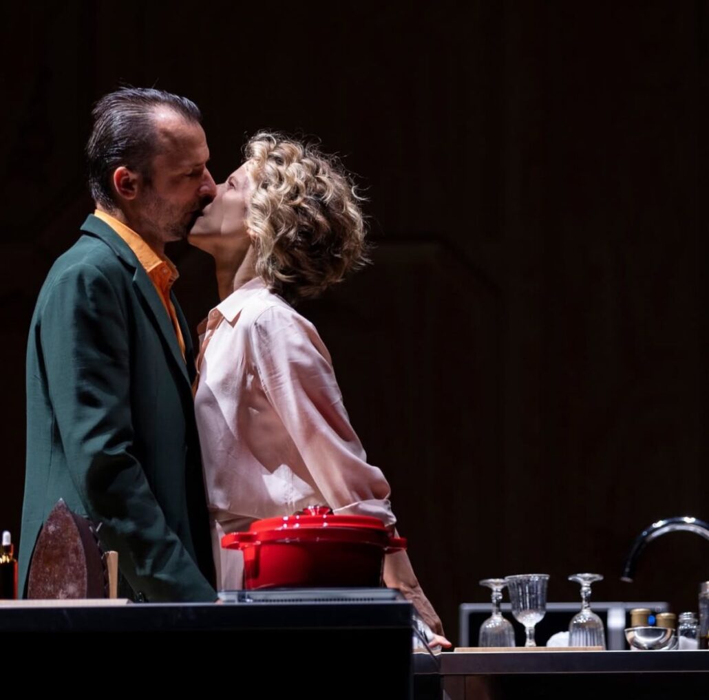 Quando Mirandolina, maestra di seduzione, si trova alla stessa tavola del Cavaliere, che la disprezza, e inizia a spargere qui e là le parole giuste e i giusti complimenti, sussurri, gesti, tutto strategicamente studiato!, e quello inizia a cedere… il loro desiderio, di entrambi, avvampa, divampa, infiamma, infuoca la scena. Pure le luci sopra le loro teste “fanno faville”, cominciano a sfarfallare, a fare rumore, a spegnersi, a riaccendersi, a riluccicare. Rappresentazione visiva di quello che sta nascendo tra loro. Un’intuizione scenografica geniale. E così il loro desiderio diventa il nostro, di noi che li guardiamo e desideriamo. E la sensazione strugge e al tempo stesso è magnifica. Quei due pagliacci, con le loro risatine e i loro sguardi, non sanno che sono perduti. Non solo quel virtuoso Cavaliere destinato a diventare un miserabile disperato che griderà amore, ma pure lei che aveva il coltello dalla parte del manico e che però non aveva calcolato come spesso chi è conquistatore, conquistato dalla voglia di conquista, possa finire per farsi conquistare. Nulla è più potente del desiderare.
