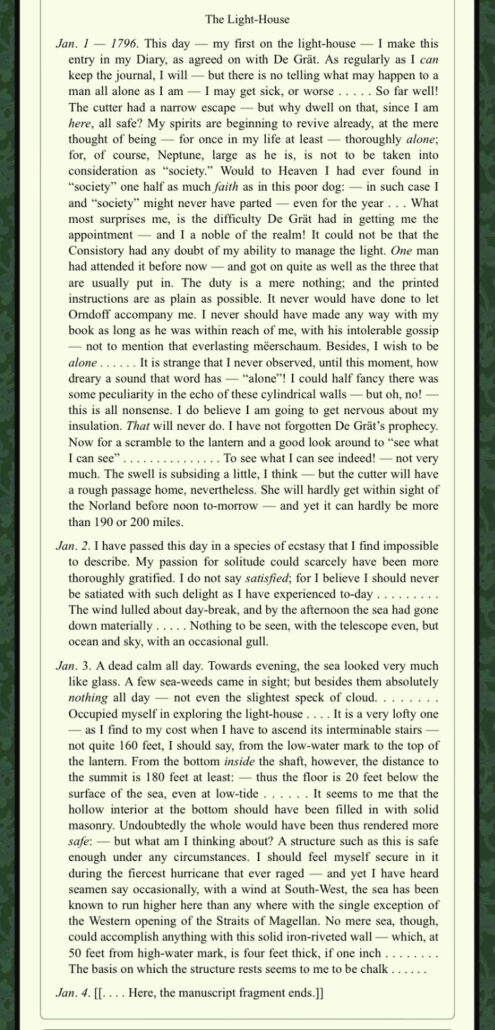 Eppure, ha qualcosa di inedito, perché è un diario, l’unico caso in cui Poe ha utilizzato questa forma narrativa. Magari lo ha interrotto proprio perché questa struttura non era la sua. E doveva apparentemente parlare di solitudine, che non è un tema nuovo nell’opera di Poe (si pensi anche alla poesia Alone), ma chissà in che modo sarebbe stato affrontato. Ed è presente anche l’accenno di una minaccia, a cui il protagonista non vuole pensare, e che quindi, sicuramente, sarà la causa della sua disfatta; questo unito al sospetto che il faro non abbia una base solida.