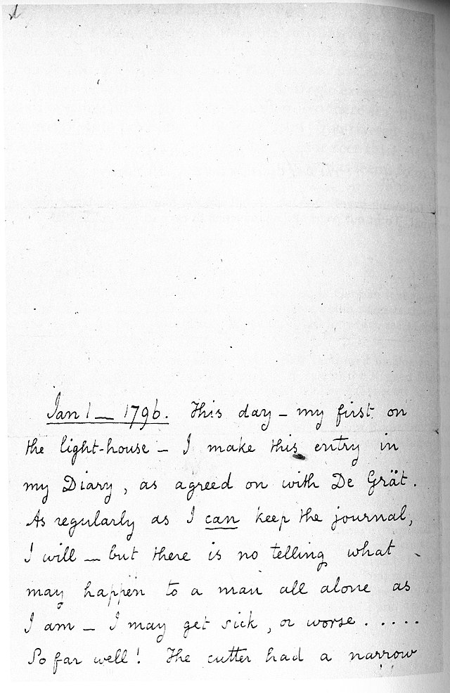 Di un uomo che ha scelto di fare il guardiano di un faro, su un’isola, per poter restare solo, a scrivere. Il racconto è scritto nella forma del diario che il protagonista sta tenendo dal primo giorno in cui è arrivato al faro, ovvero il 1° gennaio 1796.