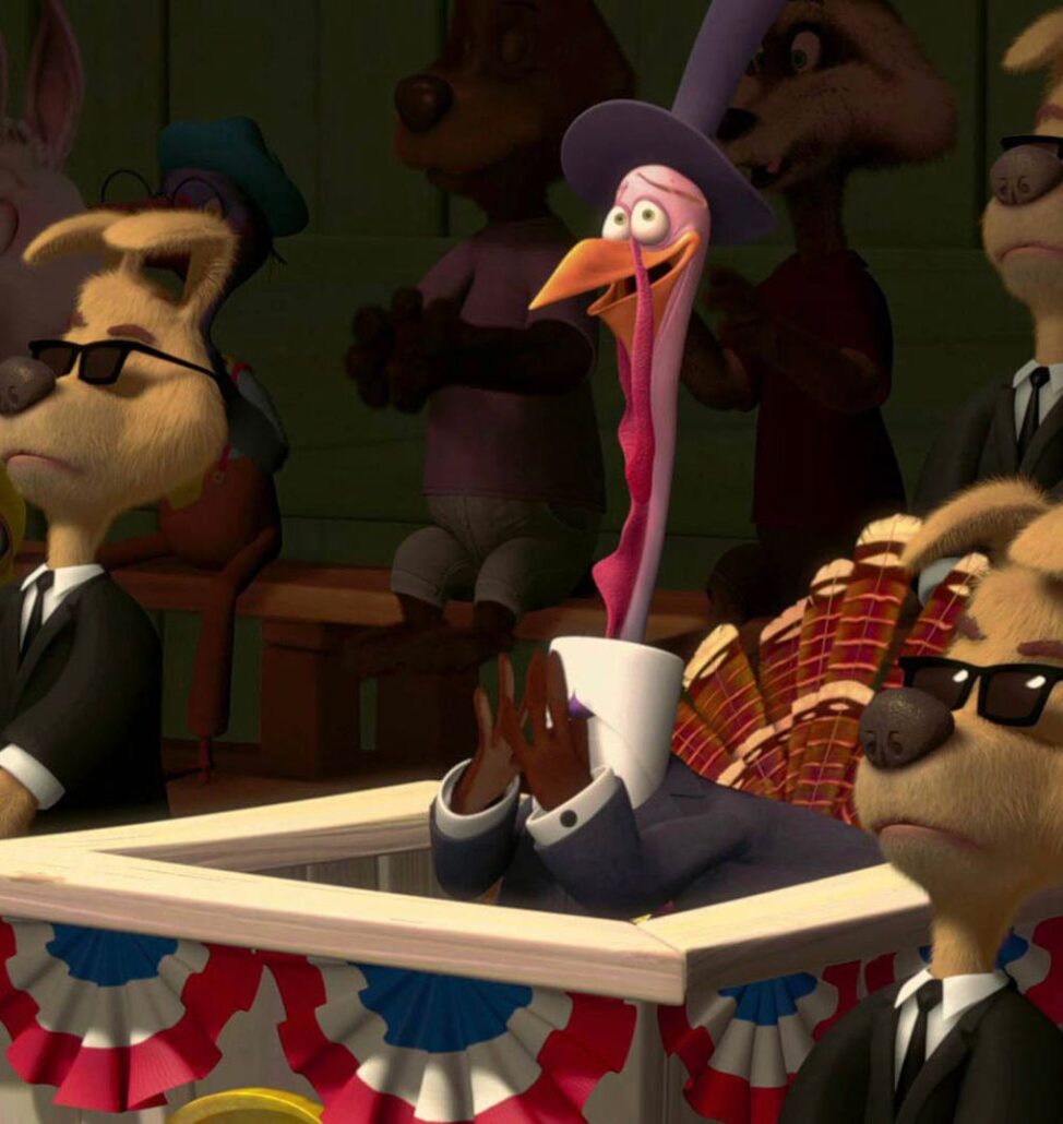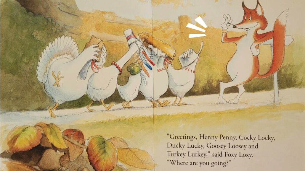 Ora, quanti di voi si aspettavano che tale film fosse tratto da un racconto popolare europeo? Io no di certo. Il racconto in questione è Henny Penny, più comunemente noto come Chicken Little. Il protagonista è un pulcino (o una gallina), che un giorno, dopo essere stato colpito in testa da una ghianda caduta dall’albero, arriva a pensare ingenuamente che il cielo stia per cadergli addosso. Egli decide di raccontare la sua tesi al re e durante il suo viaggio incontra altri animali, che si uniscono a lui e gli credono sulla parola: tra questi, il gallo Cocky Locky, l’anatra Ducky Lucky, l’oca Goosey Loosey e il tacchino Turkey Lurkey. (Sì, hanno tutti nomi in rima.) Una volpe, Foxy Loxy, offre agli animali una scorciatoia per arrivare al re, ma in realtà li attira fino alla sua tana, dove se li mangia tutti.