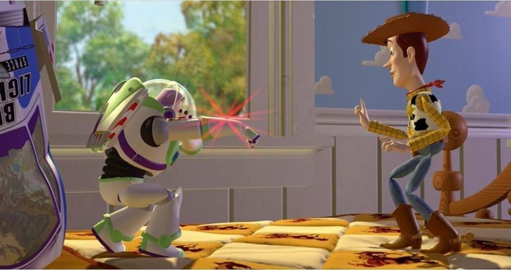 Data questa introduzione, possiamo orientarci sul primo, celebre, film di animazione in digitale che salta alla nostra memoria. Un film del 1995, stiamo parlando di Toy Story – Il mondo dei giocattoli. Una storia che parla di giocattoli viventi, dando forme alle più intime fantasie infantili. Tutti i bambini sognano che i loro giocattoli possano avere un’anima, i giocattoli per un bambino sono fedeli compagni e con Toy Story tutto questo diventa realtà, presentandoci Andy, un bambino come tutti gli altri che ha tanti giocattoli i quali, a insaputa degli umani, possono parlare, si muovono autonomamente e provano emozioni e sentimenti, e sono molto legati al loro padroncino, comprendendo quanto per lui siano importanti. Fra i giocattoli di Andy ce n’è uno in particolare, il cowboy Woody, che è il favorito del bambino. Nella situazione attuale, la famiglia del padroncino sta progettando un trasferimento, e di fronte a questo i giocattoli temono che qualcuno tra loro verrà abbandonato. Ad aggravare le cose sono i regali di compleanno per Andy, molti dei quali sono nuovi giocattoli. Uno di questi è lo space ranger Buzz Lightyear, che diventa il maggior oggetto delle attenzioni di Andy, suscitando l’invidia di Woody, che teme di essere rimpiazzato.