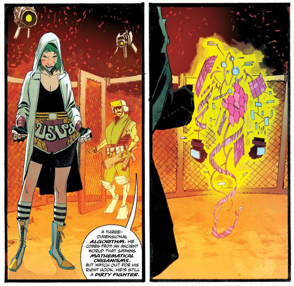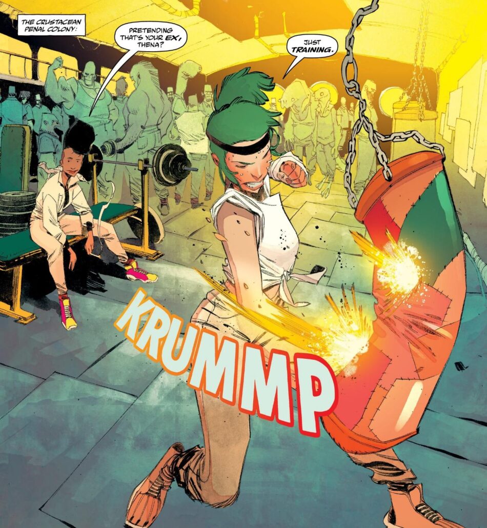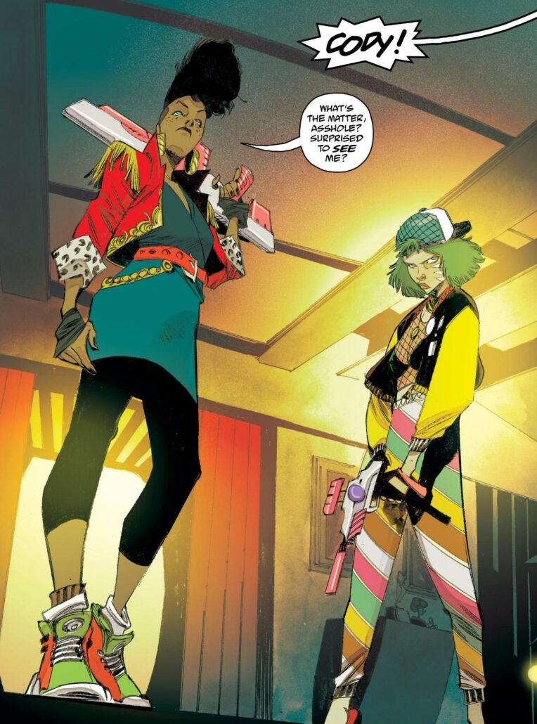 Il problema di questa serie è che la storia e le ambientazioni non sembrano essere minimamente specifiche, dando vita ad una storia di genere che del genere sfrutta poco. Per fare qualche esempio, anche se l’intero universo è in stile ’80, solo in poche sequenze questo elemento ci viene ricordato e ciò avviene solo attraverso rare citazioni, principalmente racchiuse nel primo numero dei cinque, come il fatto che Viggo sia vestito da Michael Jackson e Prince insieme o che sul pianeta Dogoth ci sia un posto chiamato “il distretto Molly Ringwald”: per la maggior parte delle pagine ci si trova di fronte ad una storia di fantascienza cyberpunk qualunque. Anche nel reparto “spaziale” c’è una carenza di fantasia e differenziazione dei personaggi: la maggior parte degli alieni sono umanoidi e gli animali sembrano comuni bestie terrestri (tranne in uno specifico caso in cui si incontra un algoritmo vivente che prende a pugni Thena, momento in cui pare che improvvisamente lo spirito di Grant Morrison abbia posseduto la penna di Millar). Anche i due personaggi protagonisti non sono particolarmente approfonditi: Thena risulta essere spiacevolmente poco sviluppata e la trama che la vede protagonista è noiosa e marginale, anche perché la maggior parte della serie ruota intorno ai problemi di Cody, la quale d’altra parte, per essere un genio criminale, pare spesso e volentieri poco attenta e i suoi piani fallimentari, facendole fare la figura dell’idiota o, per essere clementi, della perenne disinformata. Oltre a ciò, la trama è prevedibile, perennemente condita da quei toni edgy tanto cari a Millar, che perlomeno in questa serie, che nel suo funzionamento ricorda film come Kill Bill, risultano funzionali alla storia di vendetta e violenza.