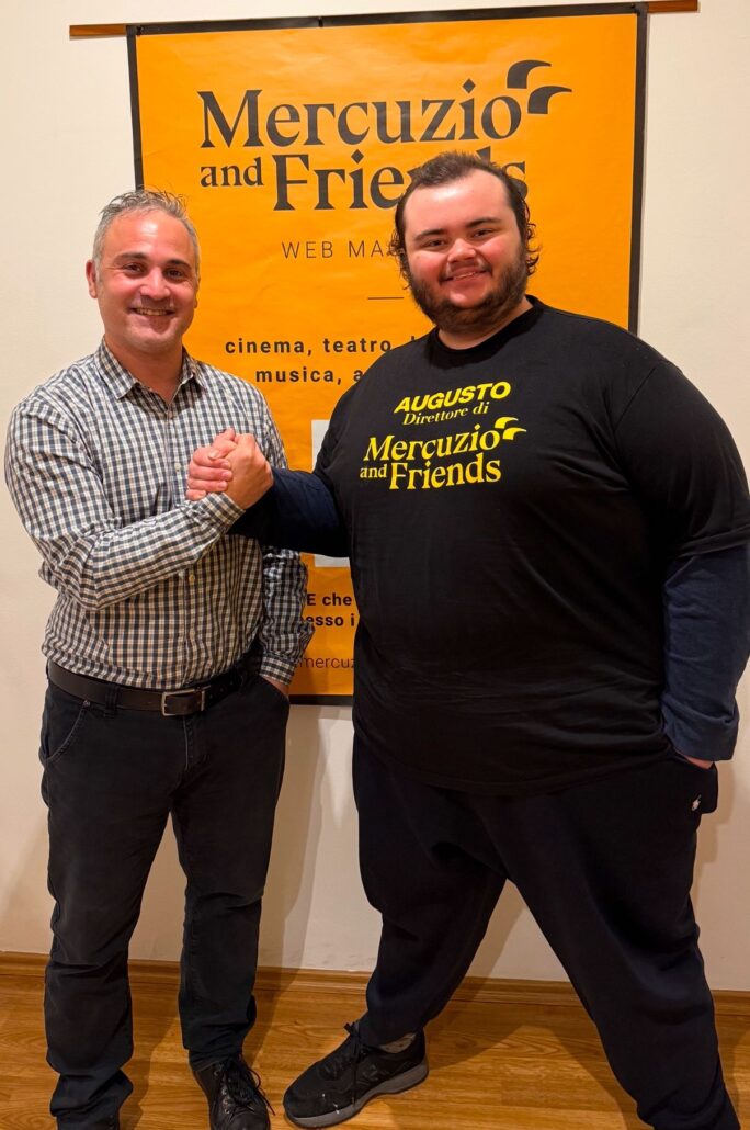 (CLAUDIO SECCI, autore del romanzo e leader del COLLETTIVO SCRITTORI UNITI, insieme ad ALBERTO GROMETTO, Augusto Direttore e Fondatore di MERCUZIO AND FRIENDS, nel mentre che rinnova, all’interno degli studi di M&F, la relazione di profonda amicizia e media partnership collaborativa tra le due rispettive realtà che rappresentano)