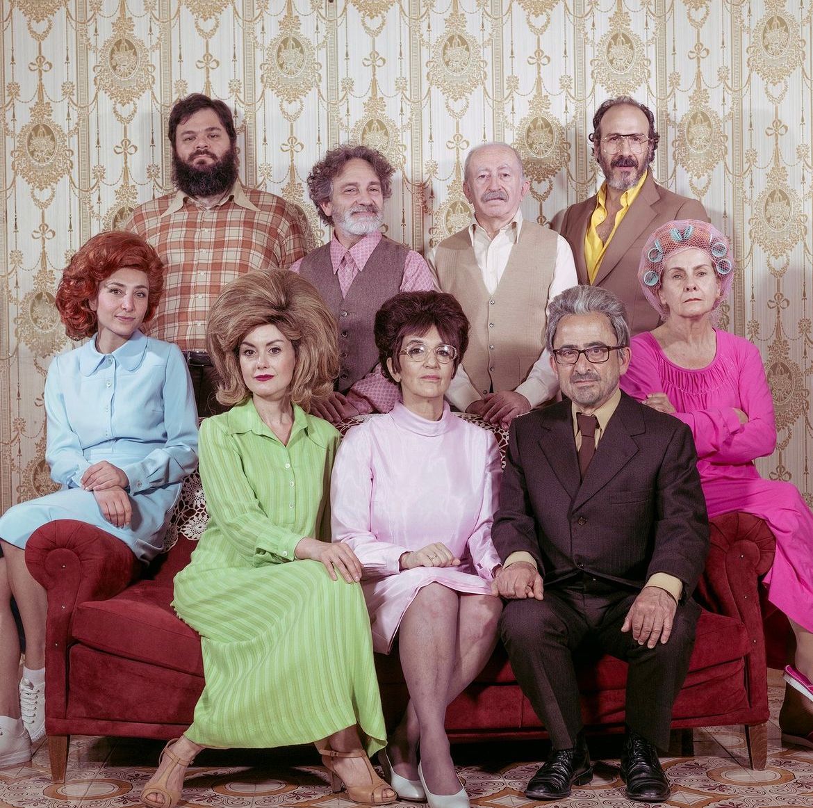 Un’opera monumentale proprio perché dipinge personaggi che monumentali non sono affatto, anche se immobili come statue. Però non hanno la loro grazia o eleganza o raffinatezza o ricercatezza. Hanno dolore, quello sì. E non è un caso se indossano tutti pacchiani vestiti coloratissimi anni ’60 e soprattutto queste enormi parrucche cotonate che sono come le loro esistenze: flaccide, pesanti, e che gli stanno strette.